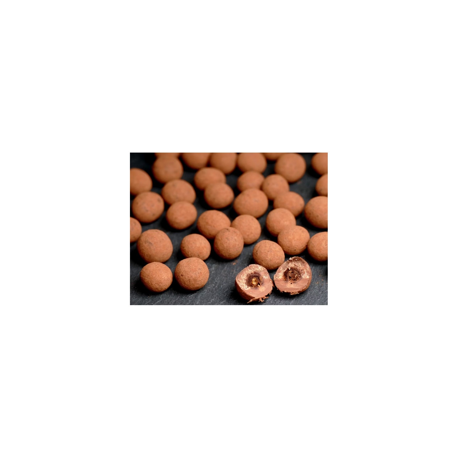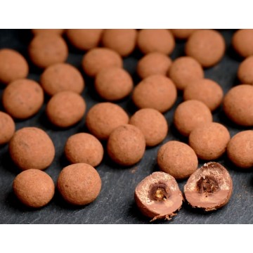 Arándanos rojos deshidratados cubiertos de chocolate con negro. La mezcla ácida del arándano con un exquisito chocolate negro no deja indiferente a nadie.