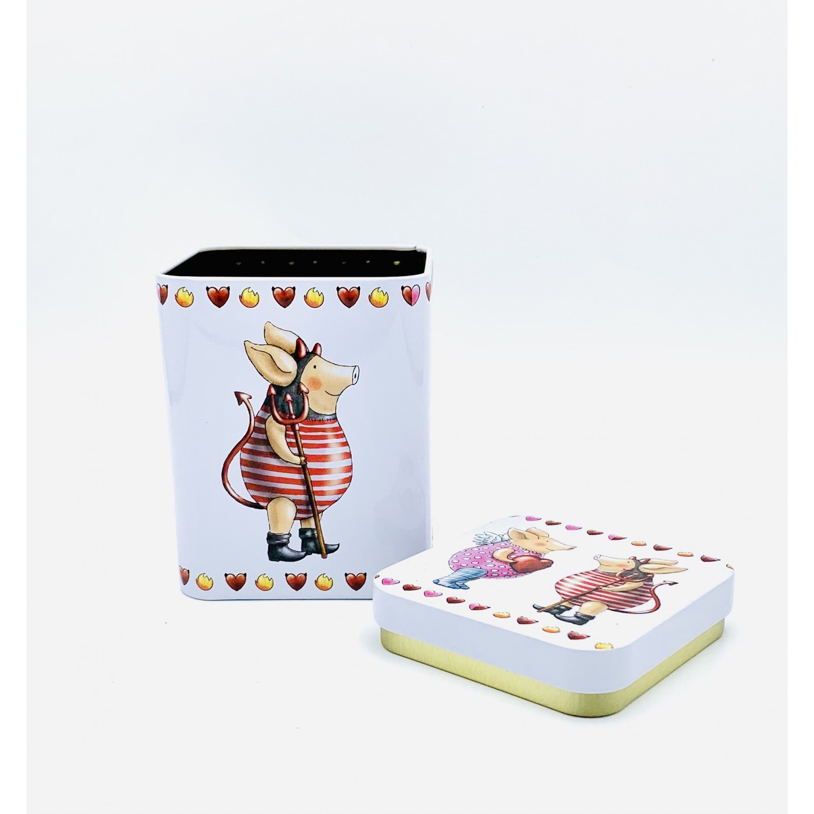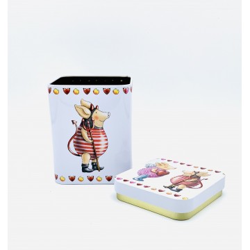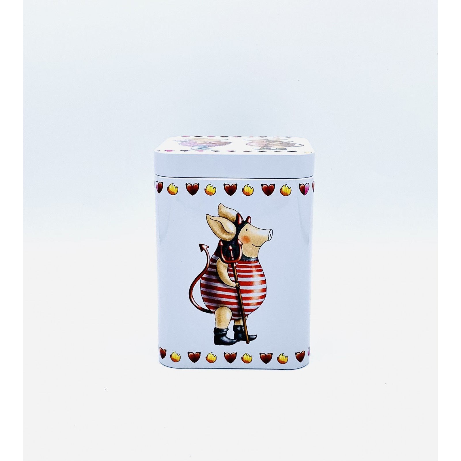 Lata en tonos rosa y violeta con doble tapa hermética para 150gr de capacidad.