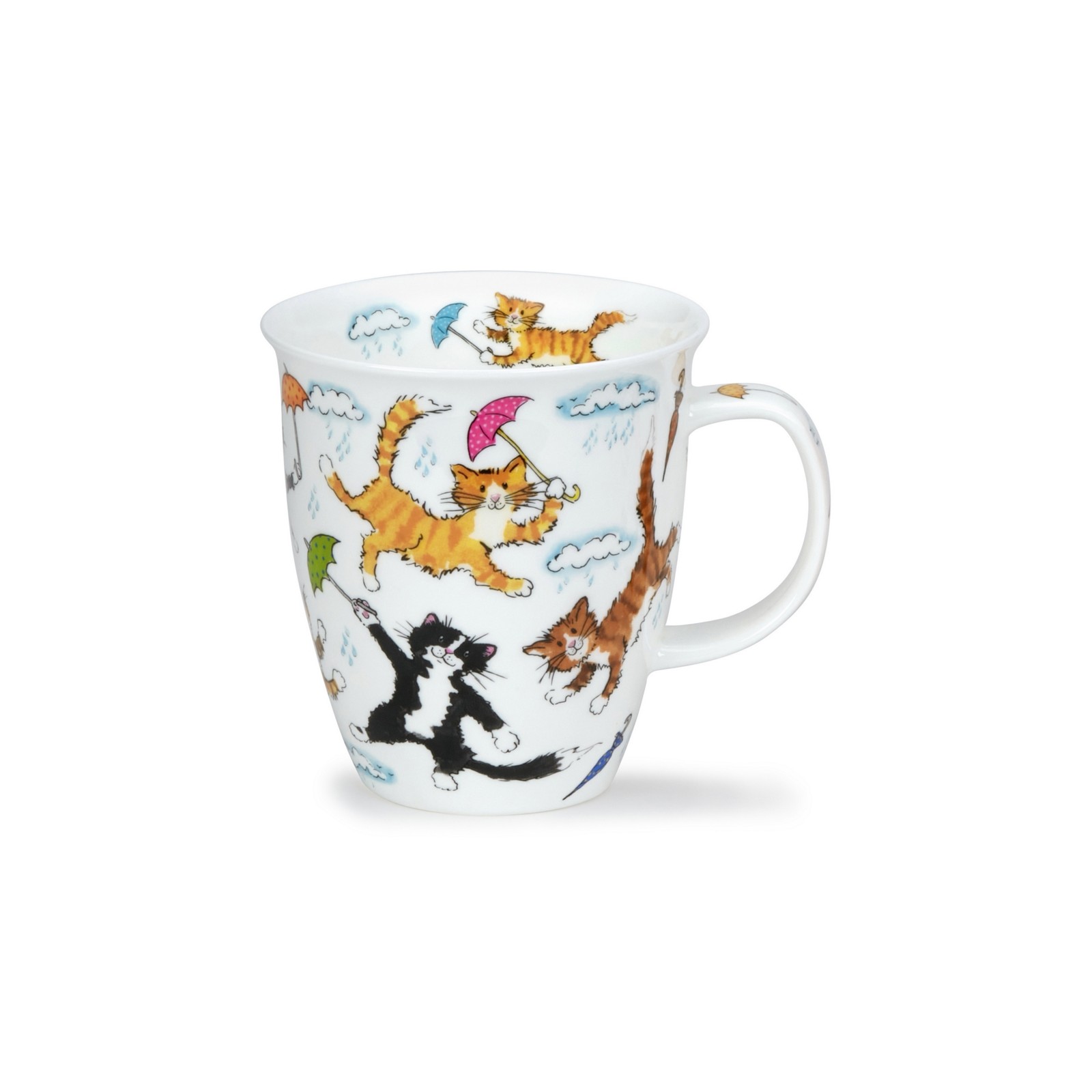 En esta taza los gato surcan en el aire con entusiasmo y esquivan la lluvia al estilo Mary Poppins, con paraguas multicolor