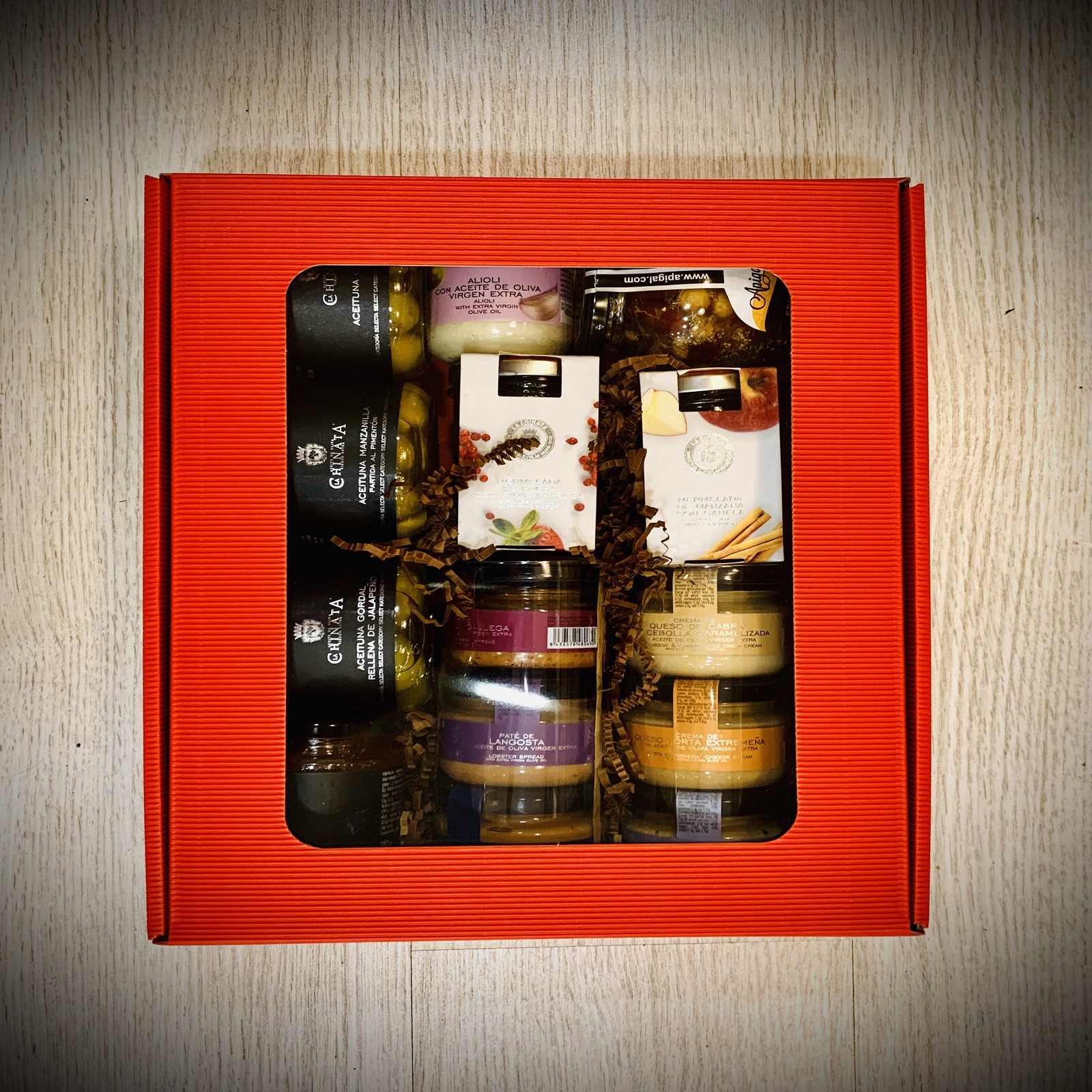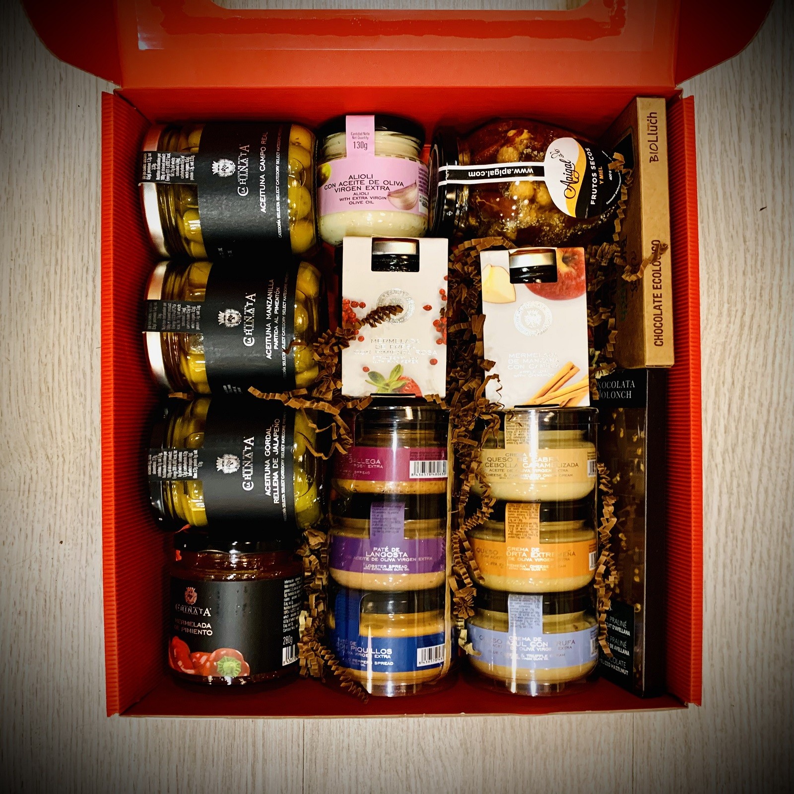 La cesta contiene; Mermelada de Albaricoque con Lima, Pack de 3 patés de mar (pulpo a la gallega, langosta y bonito con piquillos), Trío de cremas de queso (queso azul con trufa, cabra con cebolla caramelizada y torta extremeña) Mermelada de Fresa y Pimienta Rosa, Tableta de chocolate negro con trocitos de naranja, Aceituna Manzanilla partida al Pimentón, Mermelada de Pimiento, Aceitunas de Campo Real, Alioli con AOVE, Tableta de chocolate negro 85% Perú, Aceitunas Gordal rellenas de Jalapeños y una Miel de flores