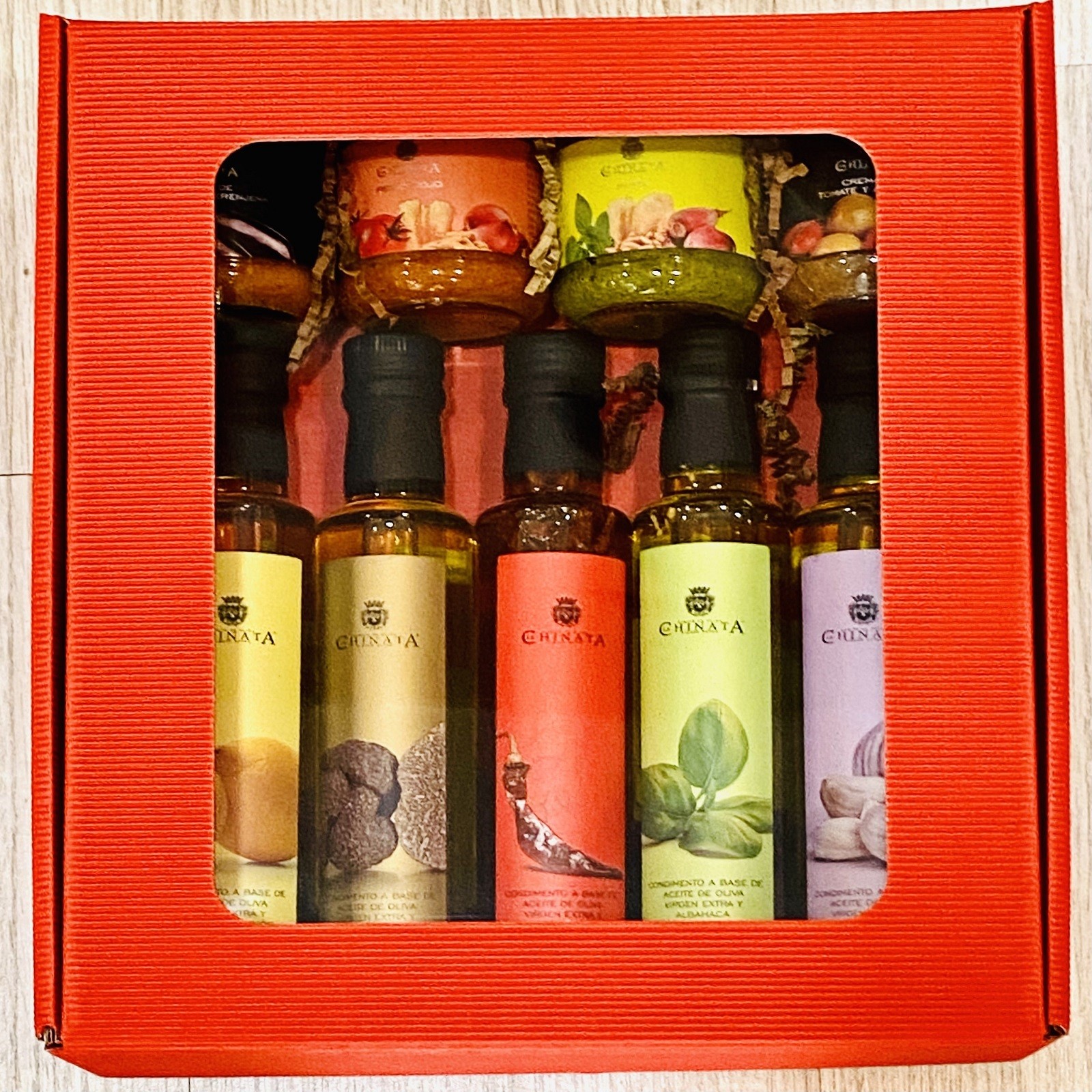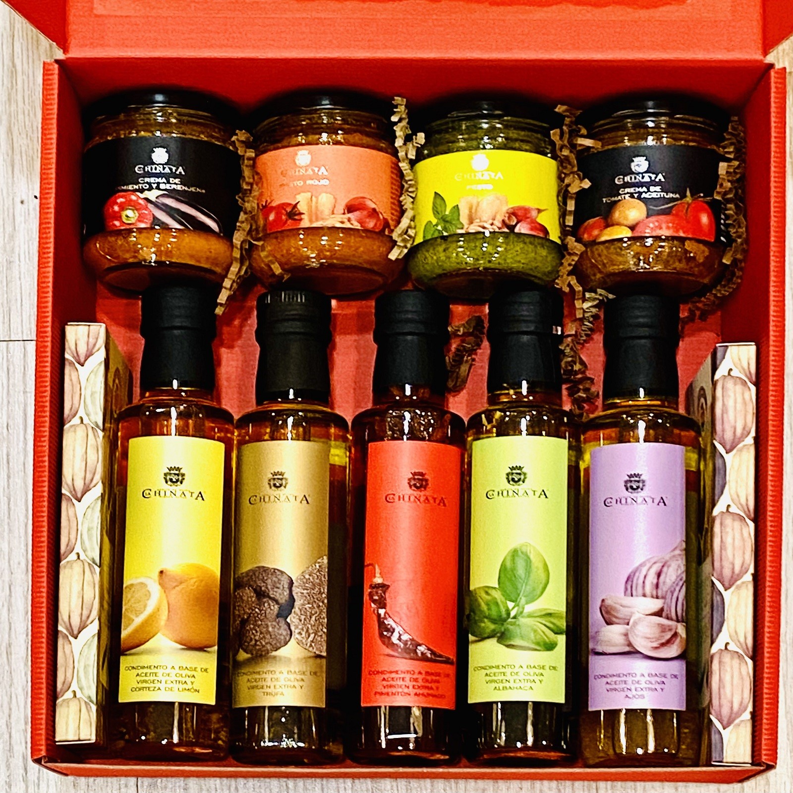 La cesta de regalo cocinillas contiene: Condimento AOVE con limón, Condimento AOVE con trufa, Condimento AOVE con pimentón, Condimento AOVE con albahaca, Condimento AOVE con ajo, Crema de pimiento y berenjena, Pesto rojo, Pesto verde, Crema de almendra y aceituna, Tableta de chocolate negro 90% Vicens Tableta de chocolate negro con trocitos de naranja Vicens