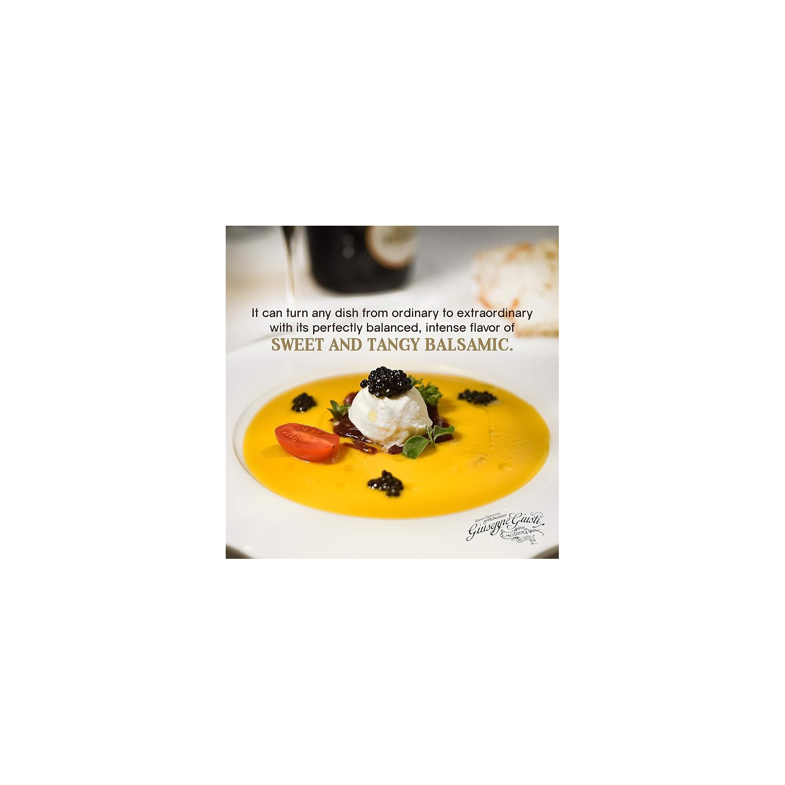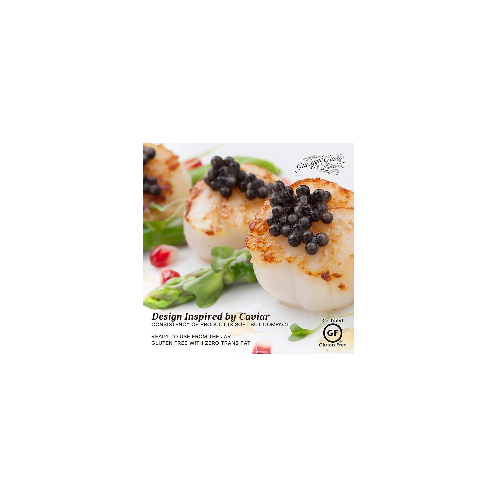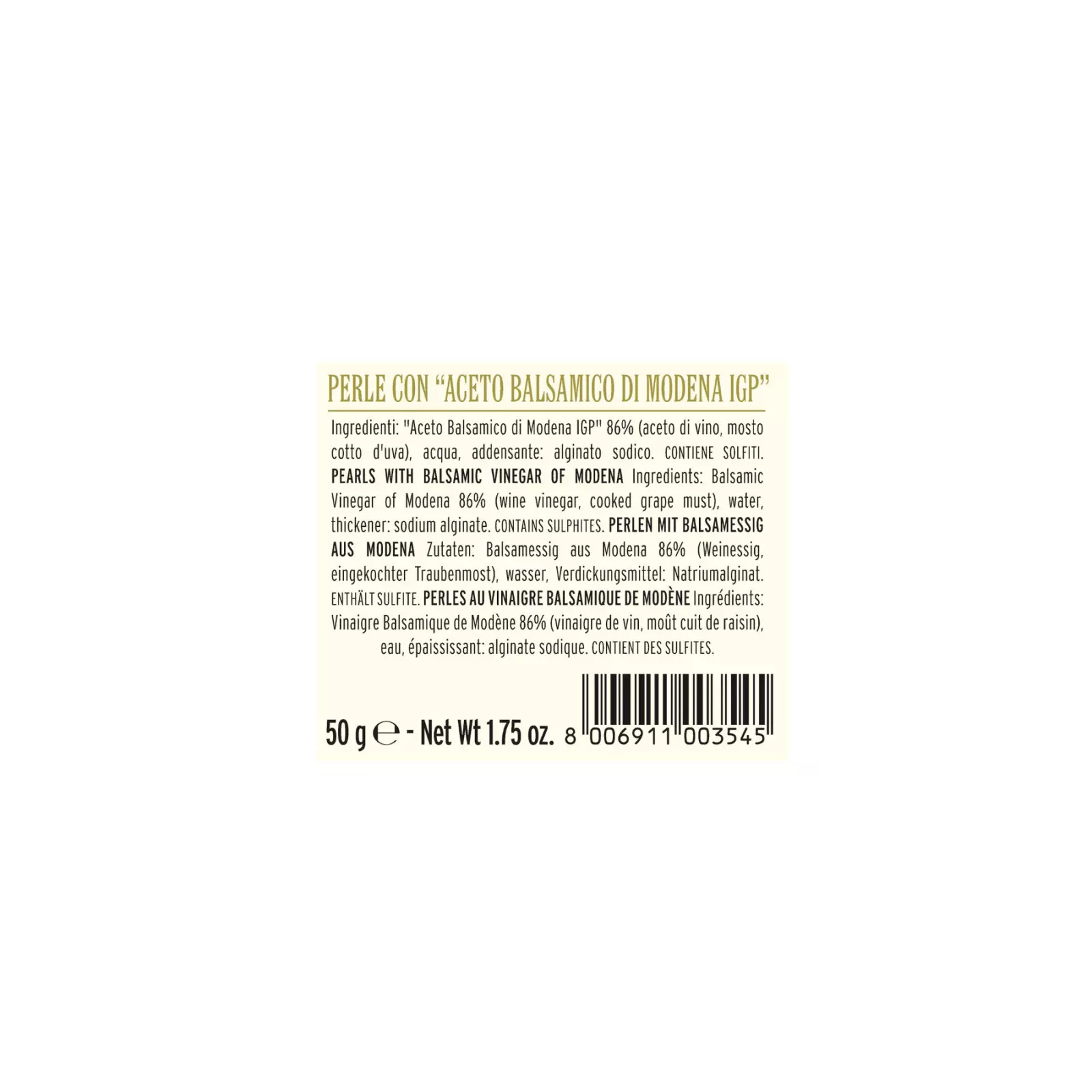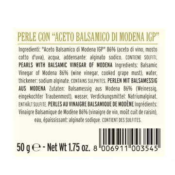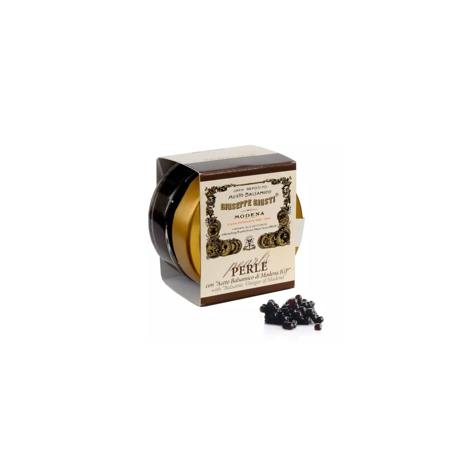 Las Perlas de Vinagre Balsámico de Módena IGP Giusti se elaboran transformando el Vinagre Balsámico Giuseppe Giusti 1 Medalla en pequeñas esferas. Este proceso de esferificación es típico de la cocina molecular. Estas pequeñas esferas negras tienen el tamaño del caviar y son perfectas para decorar creativamente sus recetas platos gourmet. Su característica de permanecer intactas incluso en platos calientes las hace especialmente indicadas sobre filetes, risottos, quesos y sobre todo tipo de canapés y tapas.