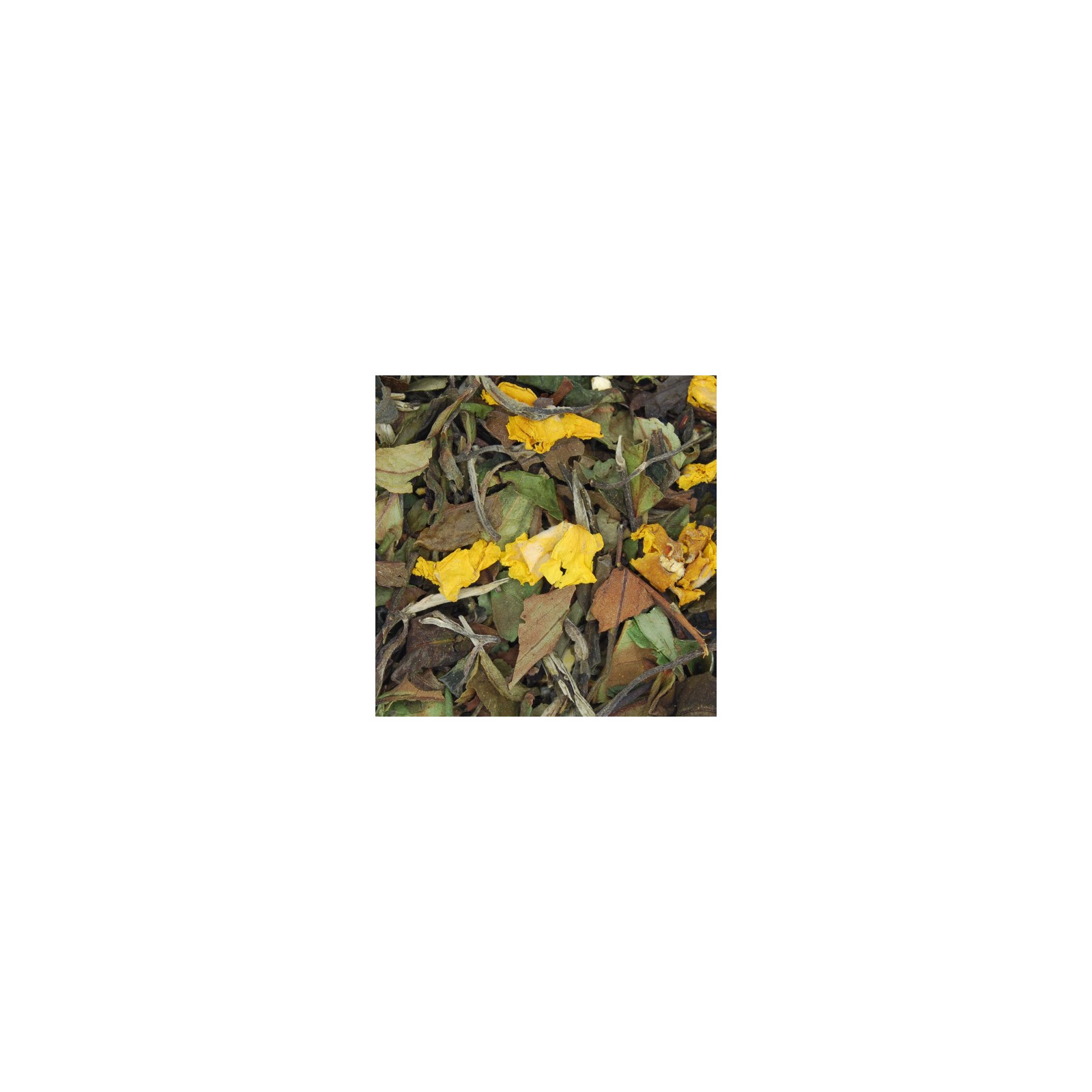 Ingredientes: Té blanco Pai Mu Tan, té verde Sencha, gránulos de naranja ( zumo de naranja concentrada, pulpa de naranja), cáscara de naranja, flores de verbasco y aromas.