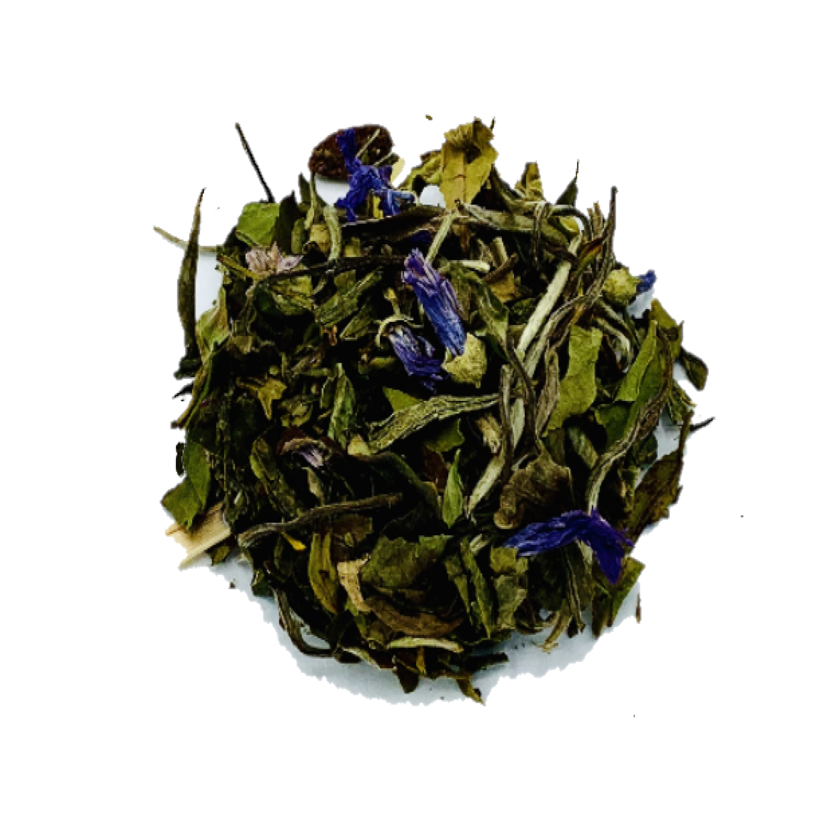 Ingredientes: Té blanco Pai Mu Tan (57%), té verde Sencha, lemongras, jengibre confitado, piña, caléndula, bayas de Goji, pétalos de rosa, malva, aroma.